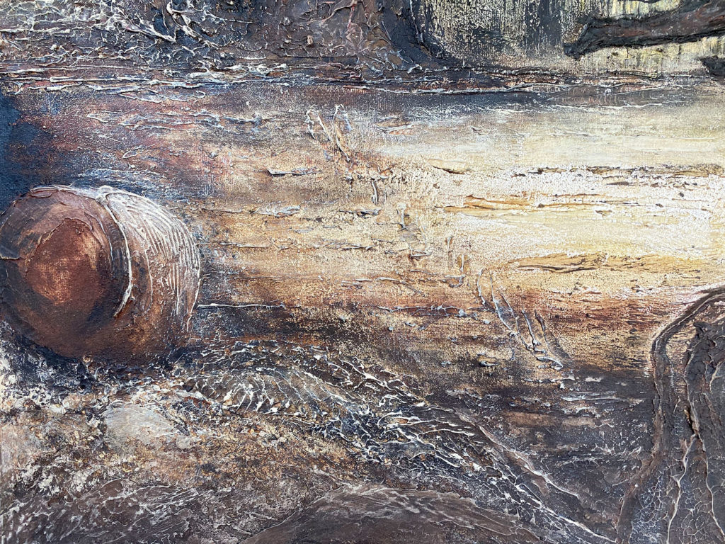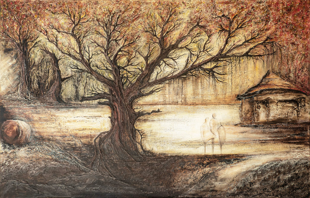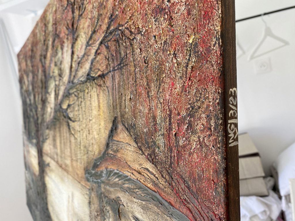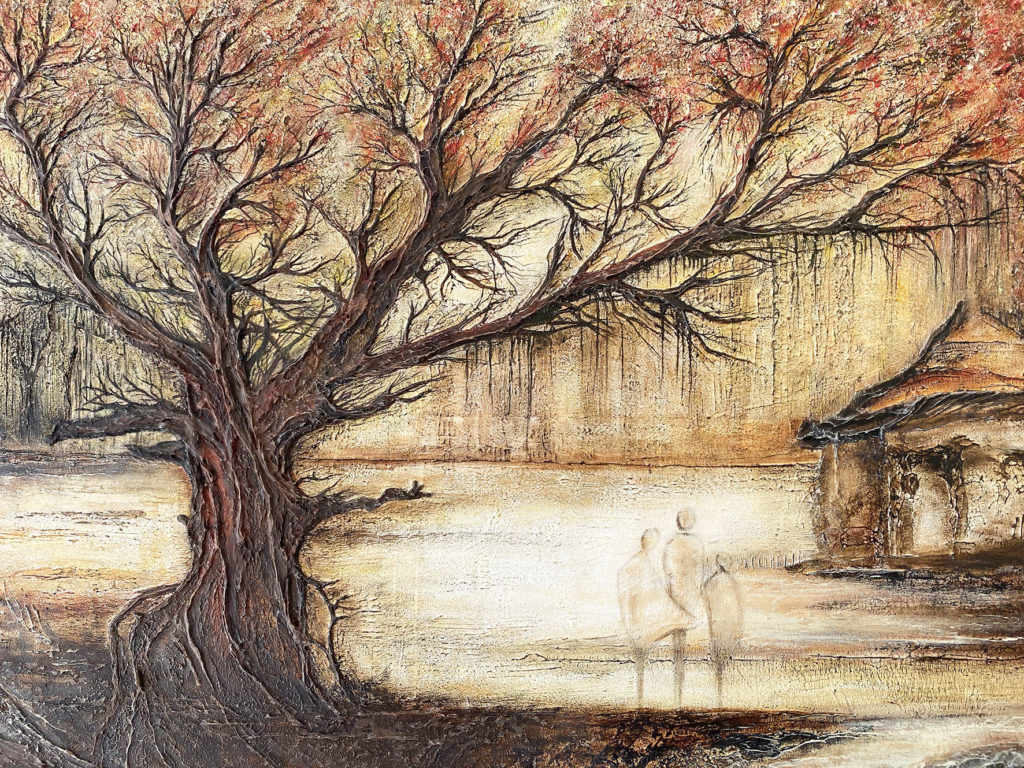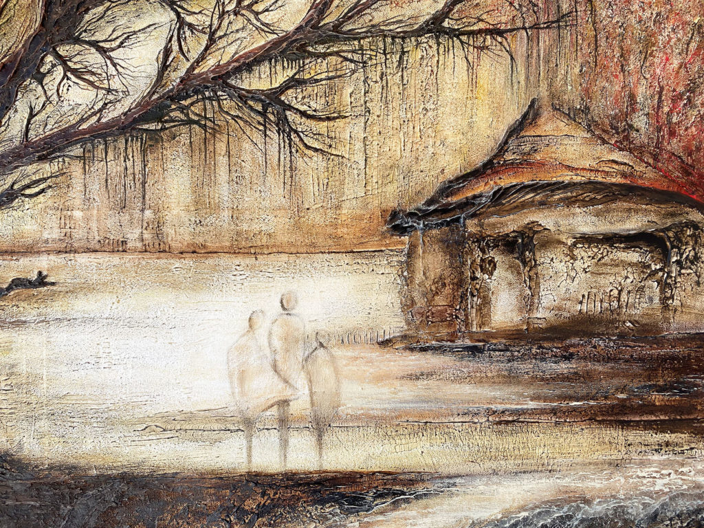 La matière, travaillée en relief, renforce cette sensation d’ancrage et de profondeur, tandis que les teintes chaudes enveloppent la scène d’une atmosphère douce et intemporelle.