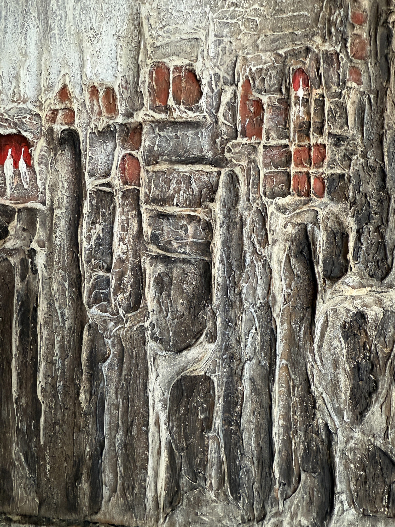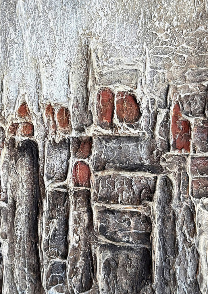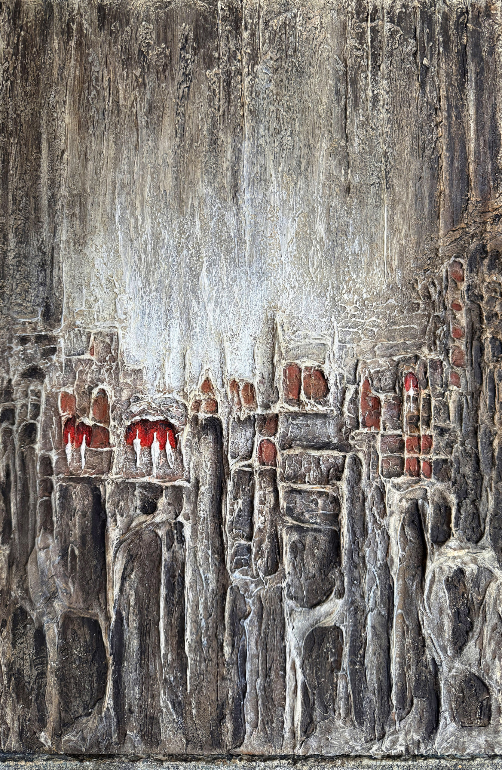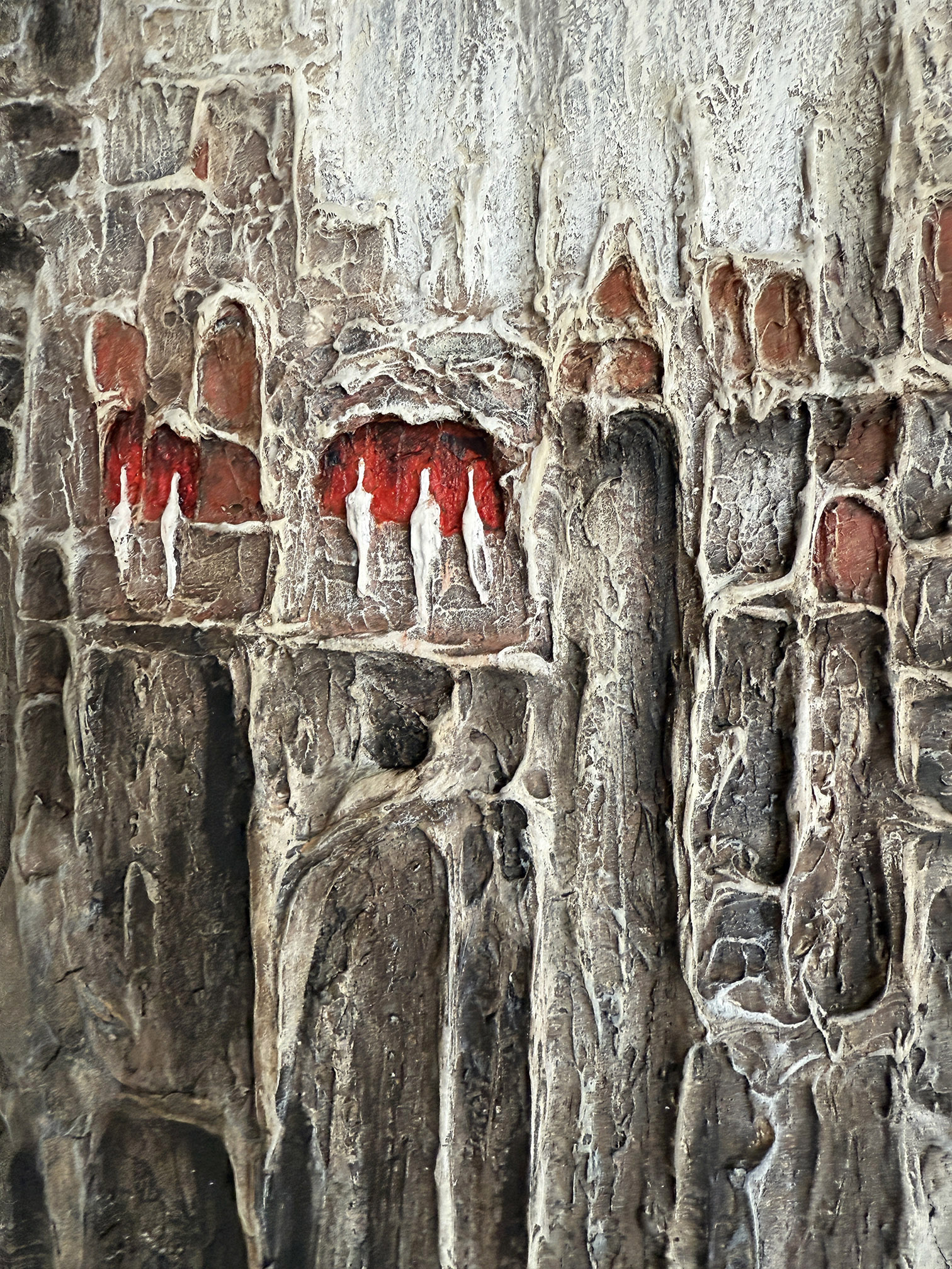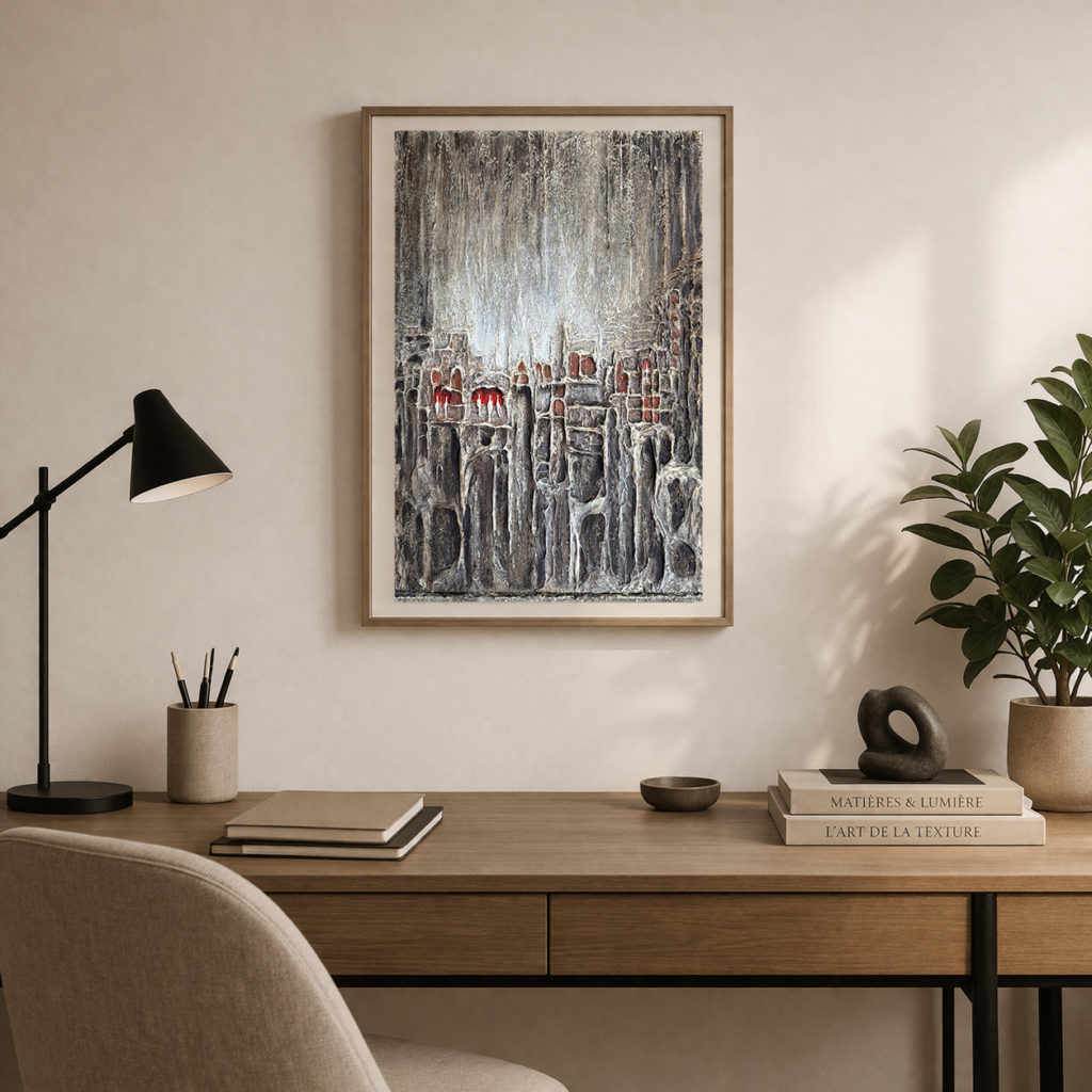 Le contraste entre les tonalités minérales et les touches de rouge crée une vibration subtile, comme une lumière intérieure qui traverse l’ensemble.