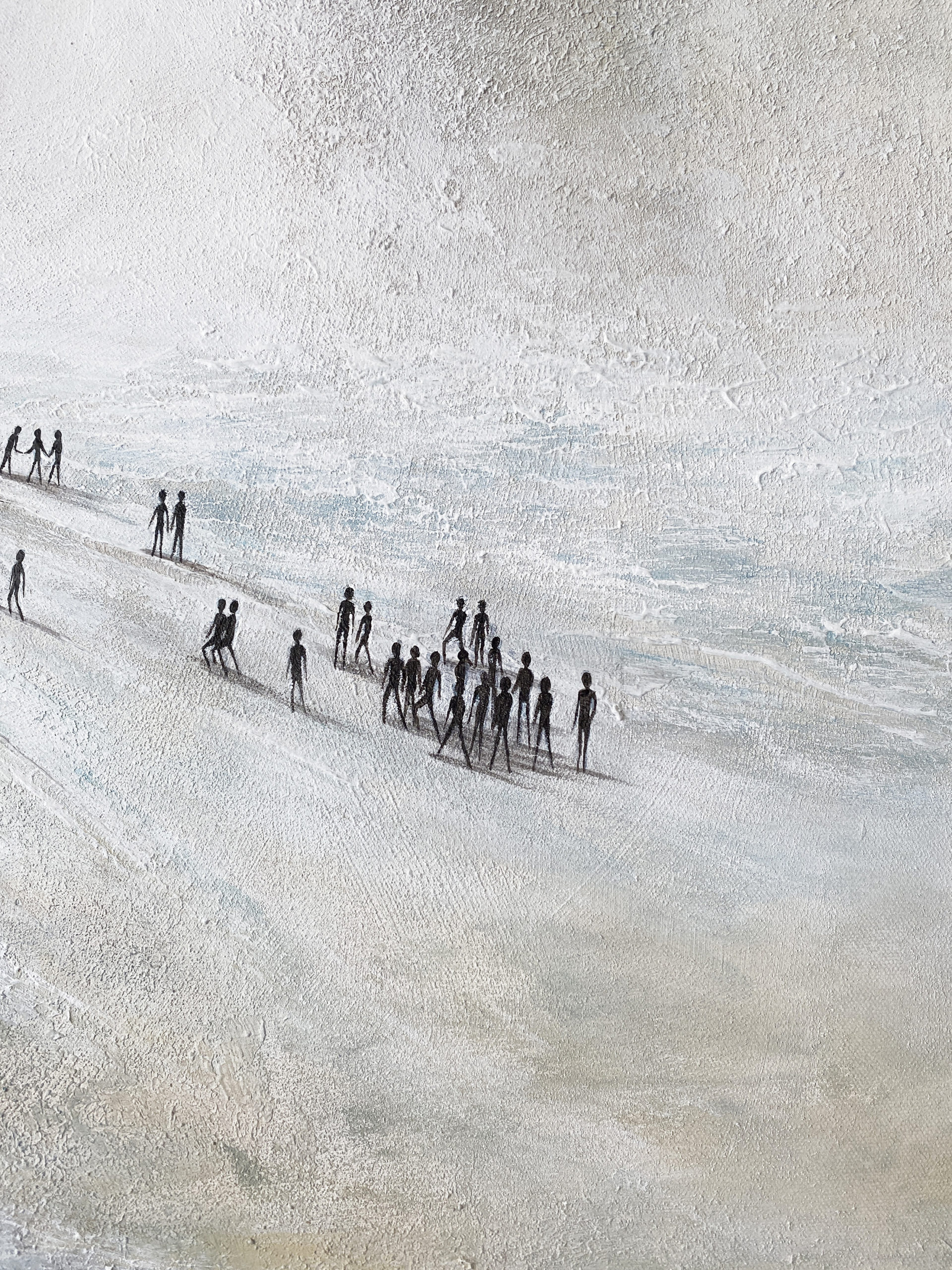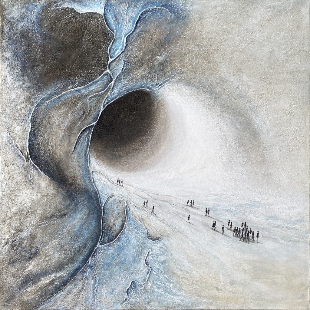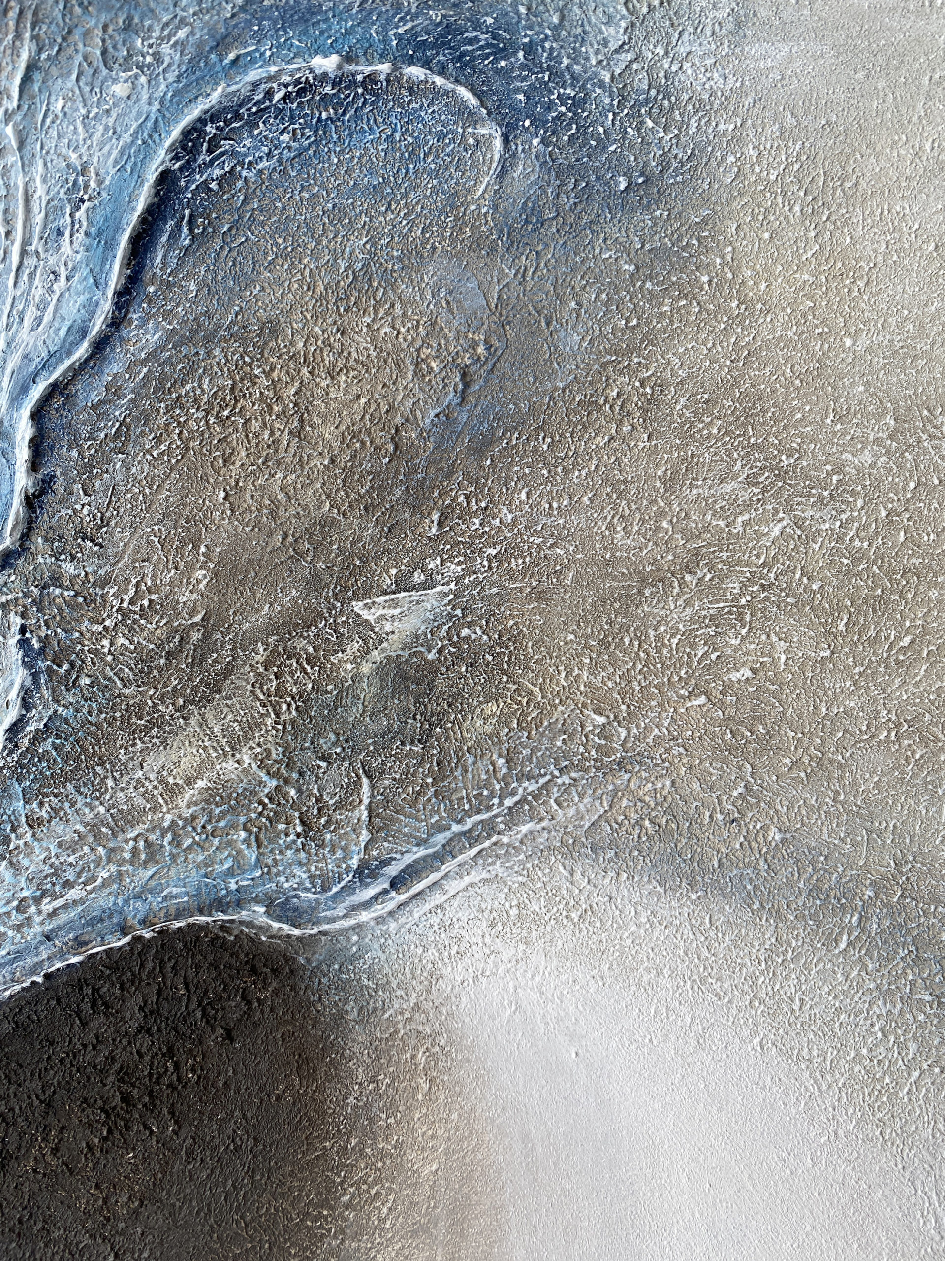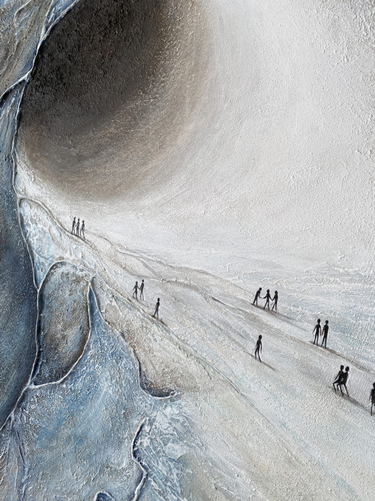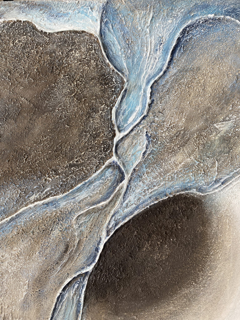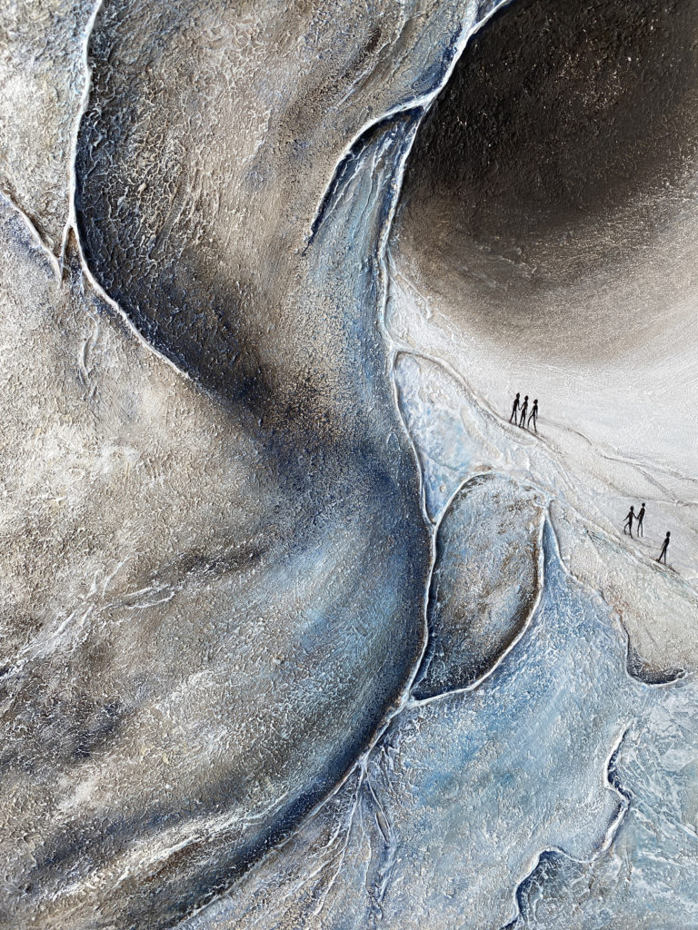 Les teintes froides et minérales renforcent cette atmosphère à la fois immersive et silencieuse, où la matière semble en perpétuelle évolution.