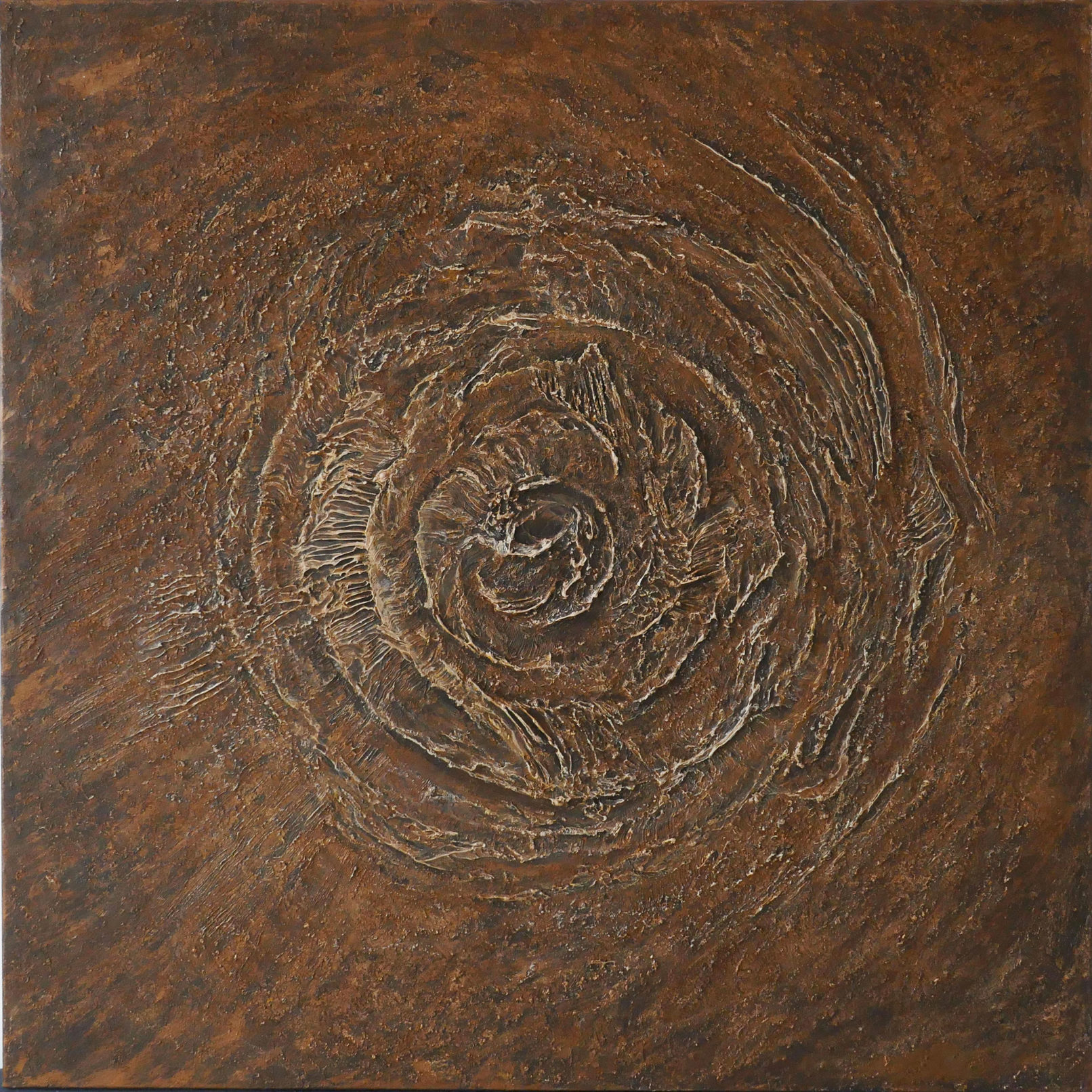Acrylique sur toile - Format 80x80 - Empreinte d'un impact sur terre, une trace laissée dans la mémoire de chacun. Une œuvre toute en rondeur qui s'éclaire par son relief et laisse l'imagination se projeter à travers ses courbes de vie.