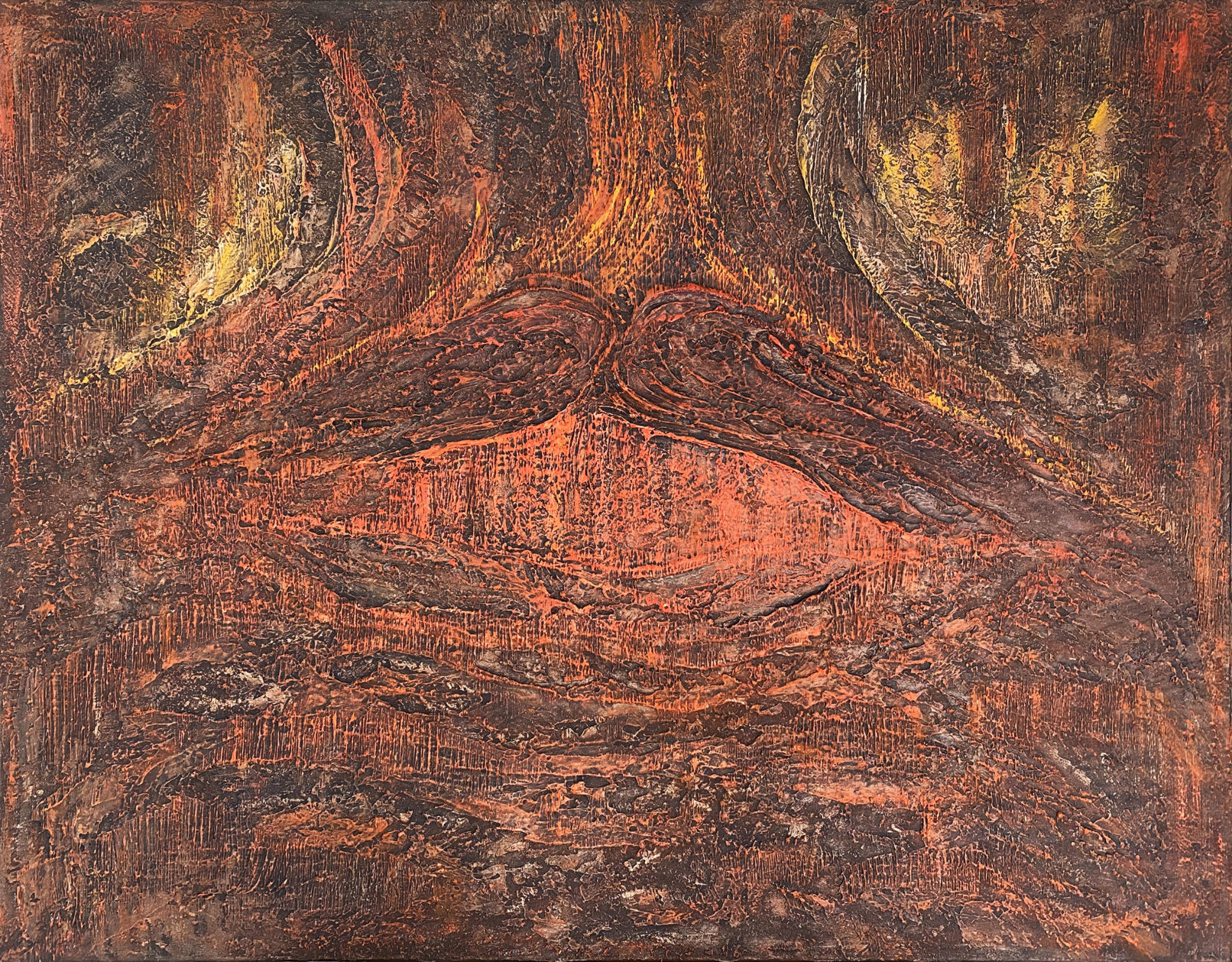 Acrylique sur toile - Format 90x70- Une signature, une marque laissée dans la mémoire de chacun. Cette œuvre s'éclaire par son relief et laisse l'imagination se projeter à travers ses tons brulés et vifs comme une foudre ou une éruption volcanique ou humaine