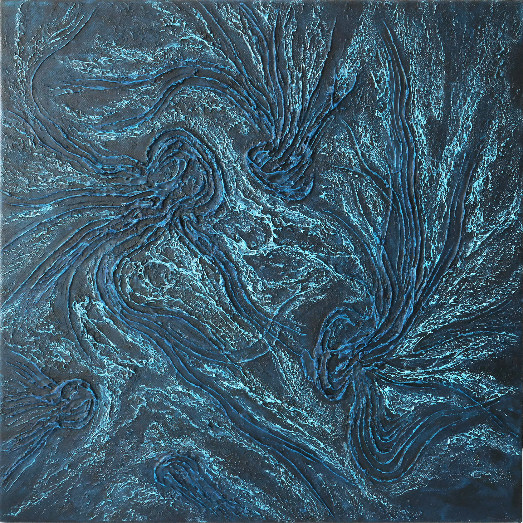 Acrylique sur toile - Format 50x50 - Une signature, une marque laissée dans la mémoire de chacun. Cette œuvre abstraite s'éclaire par son relief et laisse l'imagination se projeter à travers les profondeurs marines.