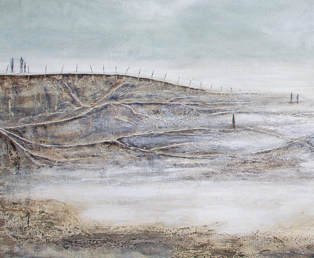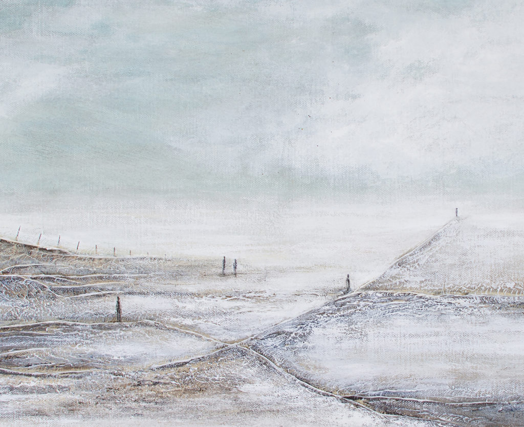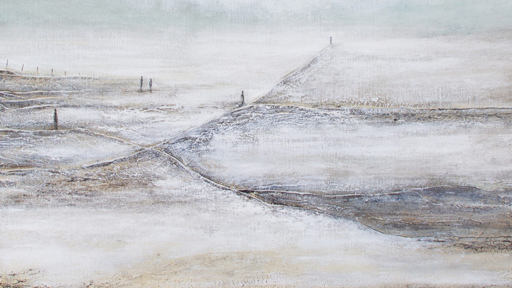 Le paysage, volontairement épuré, oscille entre matière et effacement, laissant apparaître des formes discrètes, presque suspendues.